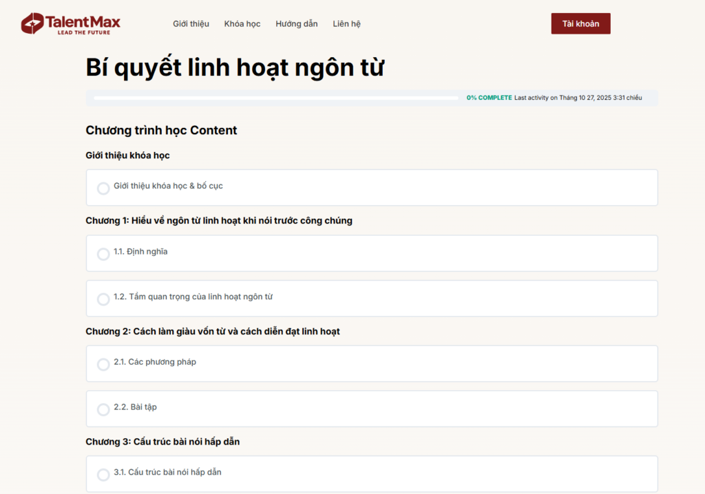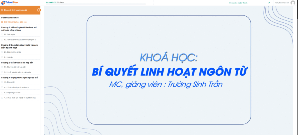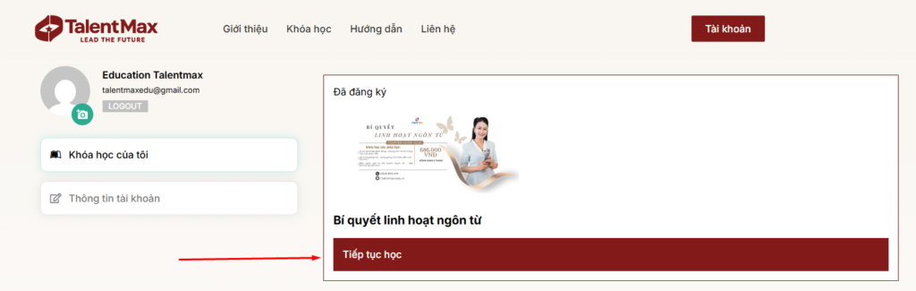 Sau khi đăng ký khóa học và thanh toán thành công, bạn sẽ nhận được thông tin đăng nhập gồm Email & Mật khẩu qua email bạn đã đăng ký với Talentmax